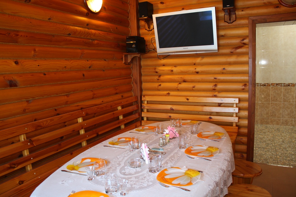 К Вашим услугам парная в стиле русской бани (веники в ассортименте), температура регулируется по Вашему желанию. Комната отдыха с телевизором, музыкальным центром и караоке. Посуда для сервировки.